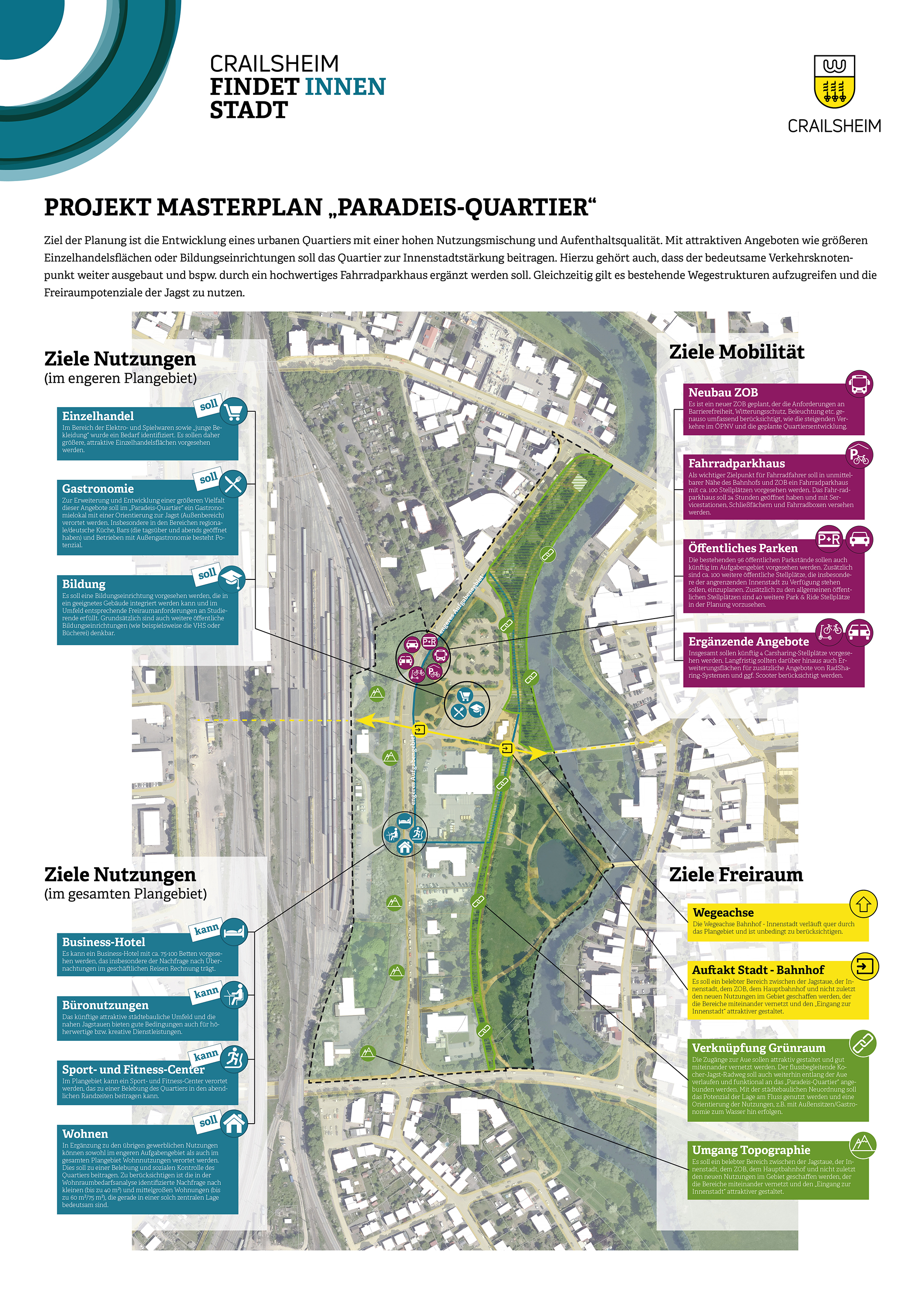 Das Gebiet „Paradeis-Quartier“ umfasst 10,2 ha und liegt im Herzen von Crailsheim zwischen Innenstadt und Bahnhof. Neben den Freiflächen der Jagstauen sind der ZOB, das Postgebäude, die öffentliche Stellplatzanlage und das Stadthotel Teil des Abgrenzungsgebiets.